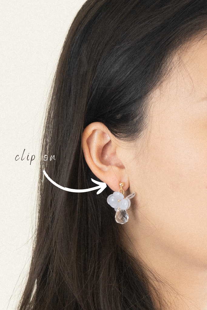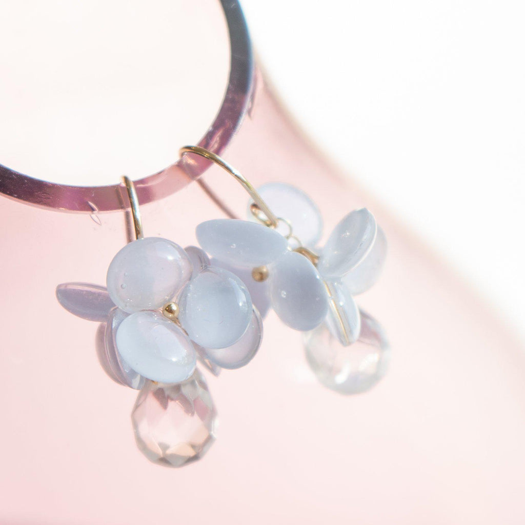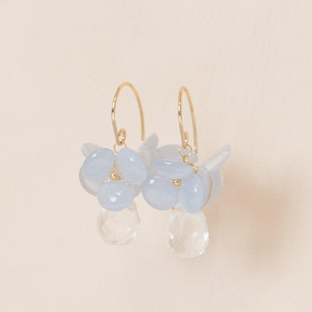 These cute and dainty earrings feature three hazy blue handmade resin flowers on each side with a faceted teardrop natural clear quartz.