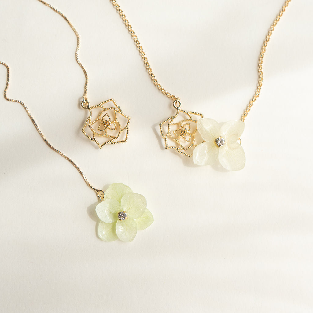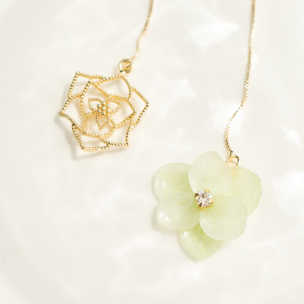 • Material: Preserved hydrangea, 14k gold plated brass, Japanese UV resin, Zircon