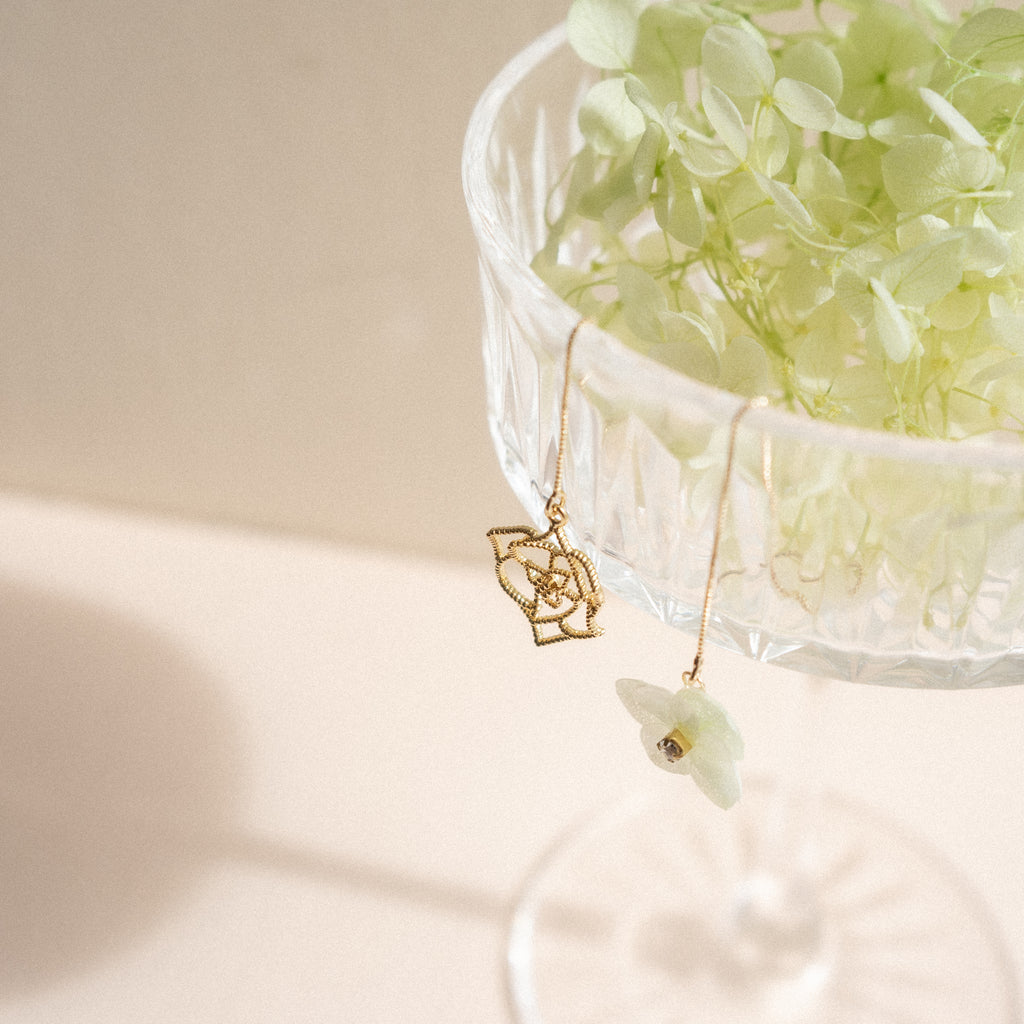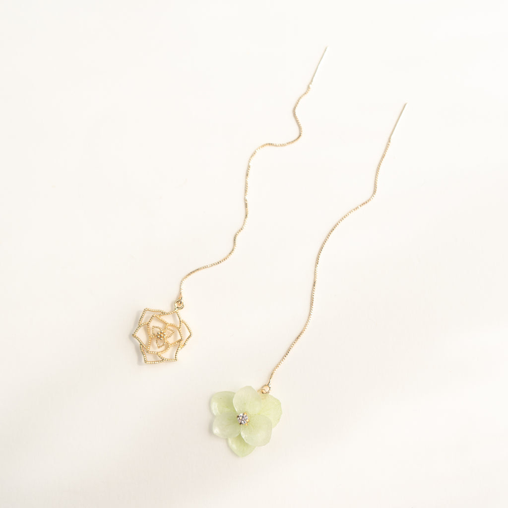 These mismatched threader earrings feature two layers of real preserved hydrangeas in light green, with quality zircon rhinestones in the middle. Plus, the dainty rose charm only makes them cuter and more fun.