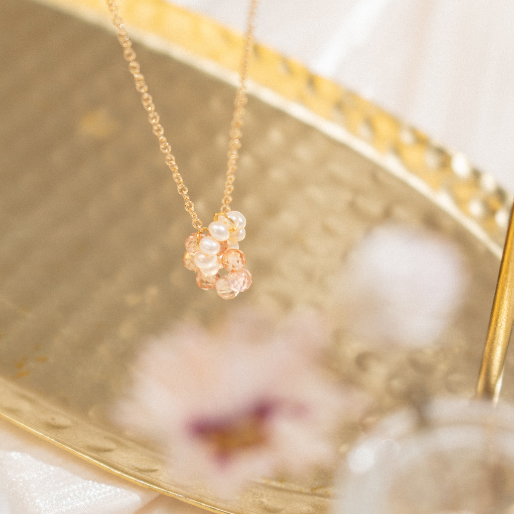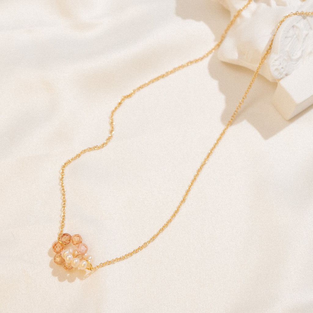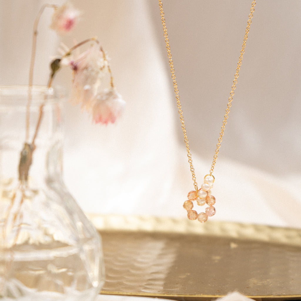 This simple yet dainty necklace features two interlocking circle charms made from premium freshwater pearls and faceted apricot zircon. Sophisticated and tarnish-resistant 14k gold plated brass hardware.