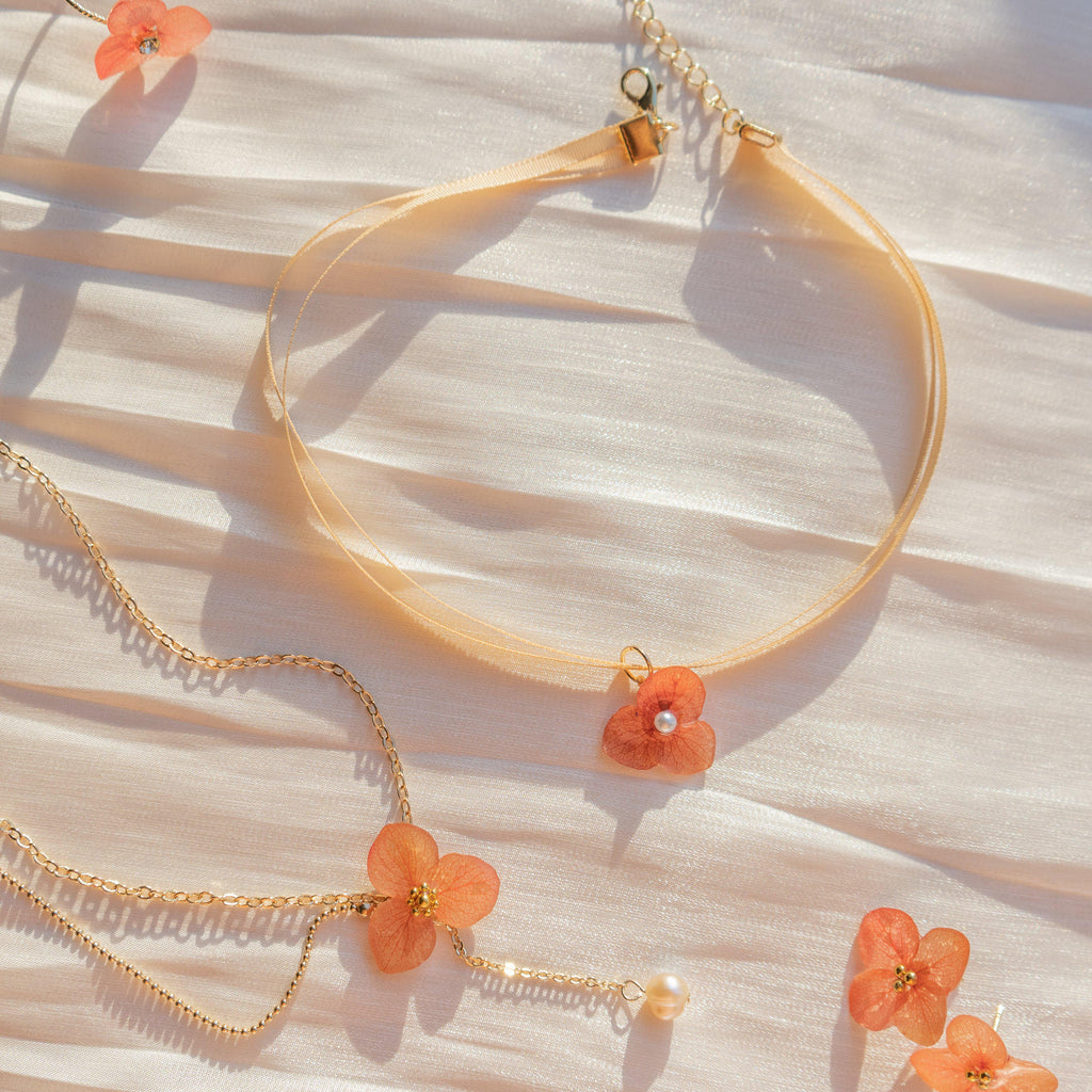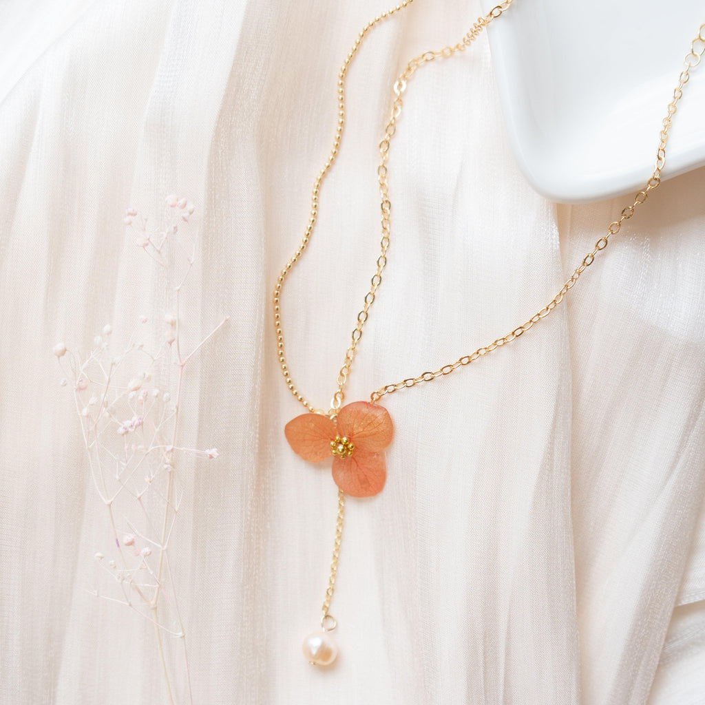 • Material: Preserved hydrangea, Freshwater Pearl, 14k gold plated brass, Japanese UV resin