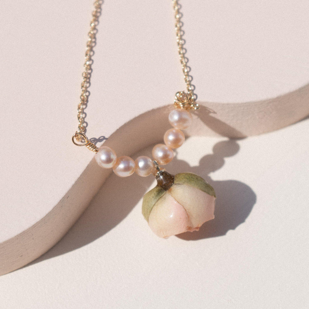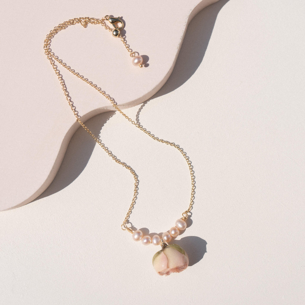 The Roselle necklace features mini pink rose with natural pink freshwater pearls. Dress up or dress down